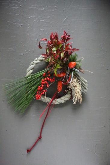 しめ縄にアクセントで実物などをあしらったお正月飾り